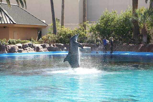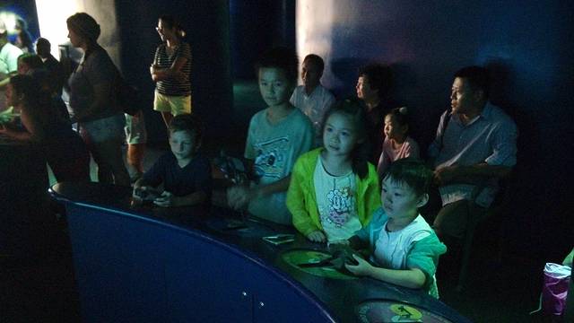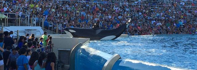 大尾巴掀起一大片水浪。坐在前五排座位受洗区 (Soak Zone) 的观众都有可能接受鲸的洗礼。大人也陪着玩得不亦乐乎。
