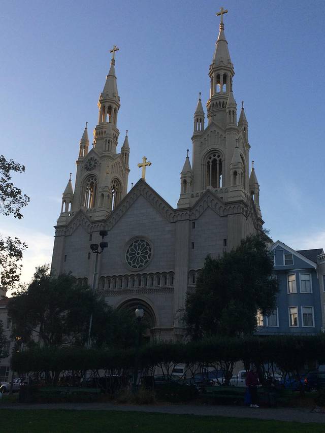 双子塔教堂,位于老城区,前面有小的广场草坪。四周可以短时停车。