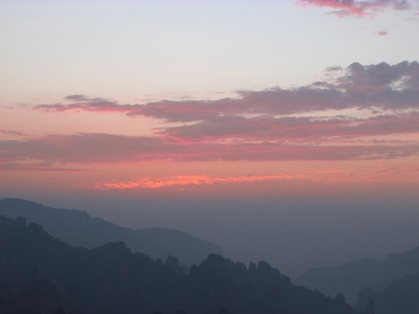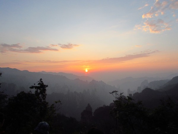 天还没亮,就赶去大观台看日出,丁香榕村到大观台走15分钟就到了。开始时东方微亮,只露一线红霞,随后红霞中出现了点点金色的霞光,将云层下方染成一片火红,又过了一会儿,半圆形红日从地平线上方横空出世,间或一个完整的太阳喷薄而出,从下至下呈现火红到浅红色,太阳逐渐升高,变得更红更亮,直至发出耀眼的光芒。这是我第一次观察如此完美的日出,十分壮观美丽。看完日出回去吃早饭,和小谷导游协商了下,去看看老屋场,老屋场是暂未开放的景点,去老屋场大都包车,包一辆七人座的车大约200元左右,其实老屋场并不远,路也不难走,全部都是砂石路,路面有点坑洼,只要不下雨,走路是毫无问题的。从丁香榕村走到老屋场我们用了不到一个小时,然后下到观景台,观景台是处悬崖,周围有栏杆,网上说没有栏杆是骗人的,尽管有栏杆,站在悬崖边看下去仍足够震慑。从观景台看过去,对面就是百龙天梯,百龙天梯前面就是神兵聚会景观,百龙天梯、观景台与神兵聚会是三角形的三个点,所以在老屋场看神兵聚会也是相当不错的,不用排队,不用花钱,想看多久就多久,关键是人很少,大可随意摆拍。看过昨天天子山,再看神兵聚会,也没觉得有太大特别,只是这里的石峰更尖削更集中一些罢了。神兵聚会的旁边就是传说中的空中田园,那是一个在悬崖上开垦出来的农田,从山上往下看,空中田园就是一个悬浮在半空中的平台,只有一条小道连接旁边的山,供农民出入。中午回到丁香榕村吃午饭,然后乘环保车去杨家界的乌龙寨,乌龙寨是当年土匪窝,规模不大,进出山寨的路非常狭小,而且多弯,多处道口需侧身才能通过,充分体现了易守难攻的地形特点。过了乌龙寨,就是天波府,其实它是一个观景台的名称,这个观景台高高在上,需要攀爬一条近乎垂直的铁梯,必须手脚并用才行。在天波府看石峰与别处稍有不同,这里的石峰大多呈墙壁状,还只剩半边墙,感觉有点像是残垣断壁,每一堵石墙都非常雄伟高大,并排而立,颇为壮观。看完天波府原路返回,去一步登天和空中走廊,看这两个景点性价比不高,首先要爬一个小时山路,上一步登天要爬上类似天波府的铁梯,但看山感觉却不如天波府那般壮观奇特。再走二十几分钟山路到达空中走廊,也是一个观景台,山势一般,结束后再原路返回又是一个小时,感觉有点累,一路上也没有什么风景可看,如果时间紧,体力欠佳,可只去乌龙寨和天波府,不必去一步登天和空中走廊。顺便说一声,这几个景点离新建的杨家界索道上站很近,来去索道不用乘车就可以到达,上下杨家界索道都不用排队。