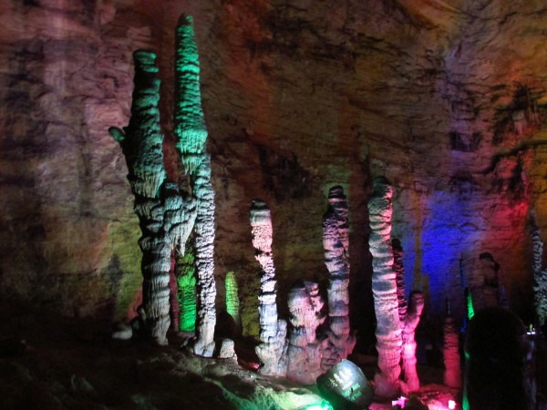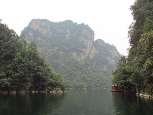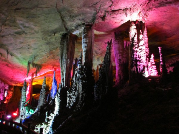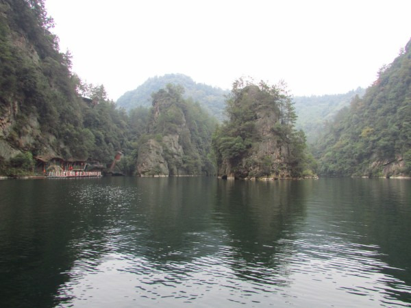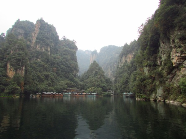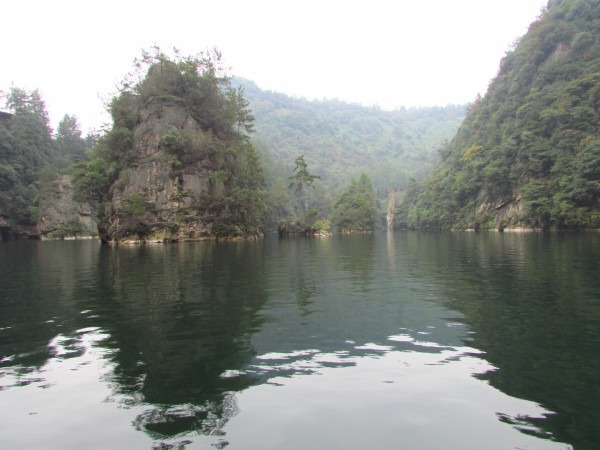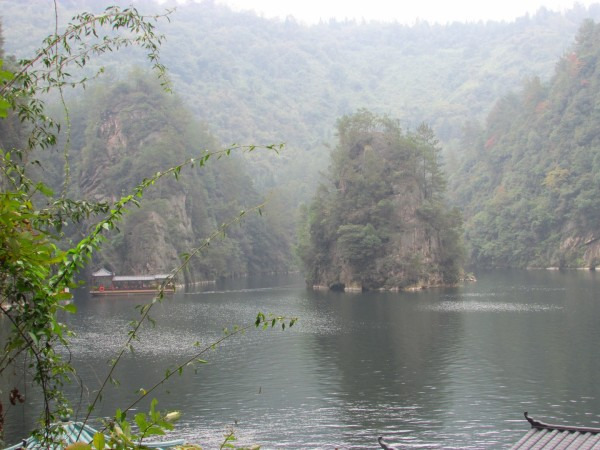 上午我们乘坐的K533次列车晚点了半个小时,8点20分到达张家界,天气预报说今天有雨,我们就决定先去黄龙洞和宝峰湖,等天好再上山。火车站附近就是汽车站,有班车直达武陵源镇,每人12元。这里说明一下:我们通常所指的武陵源风景区,正确叫法是“张家界国家森林公园”,因为座落在张家界市的武陵源区内,所以也叫“武陵源风景名胜区”。班车一个小时左右到了武陵源镇,再转1路公交车(1元/人)大约20分钟到达黄龙洞,门票100元,感觉有些小贵。进入景区首先是一个公园,有一些水车之类景物,走过一段路到达洞口,凑足一定人数才放行入内,这样可以跟上讲解员。进洞后的一段路上有一些零星的钟乳石,感觉不怎么样。随后出现一条地下河,此时需要排队候船,好在人不多,大概排了半个小时上了船,穿过一条幽黑的地下河,大约8分钟到达河的另一头,黄龙洞旅游才真正开始,前面的景观全部都是铺垫。溶洞很大,里面有大量石钟乳和石笋,有的孑然独立,有的成片林立,形态各异,在洞厅中蔚为壮观,在溶洞的第四层伫立着镇洞之宝“定海神针”。在洞内共用了三个小时,感觉不值100元门票价,里面石钟乳与其他地方溶洞没有什么特别之处,并且黄龙洞相当于一个八九十岁老人,很多石钟乳已经不再发育,显得老态龙钟。出了黄龙洞景区,乘1路车到武陵源镇换2路车到宝峰湖,其实宝峰湖景区离镇中心不远,下1路车走过去也只有20分钟。我们见雾气仍很重,而且时间也不早了,就决定等明天天好了再玩宝峰湖。景区附近大小宾馆众多,我们找了一家旅店住下,双人标间50元,设施齐全,房间也很宽敞,于是早早休息,期待明天天气会好一些。