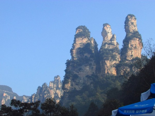 今天天气晴朗,心情大好,一早便赶到武陵源门票站,我买的是优惠票160元(全票245元)。进入景区先乘环保车到十里画廊,十里画廊就像一个放大的盆景,晨雾缠绕在群峰周围,随着太阳升起,雾气袅袅消散,宛如天堂,其中有一座山峰酷似一个老人背着竹篓采药,令人印象深刻。小火车在我们身边来回行驶,感觉是漫步在阿尔卑斯山下。十里画廊走到头也就是二十几分钟,到头后原路返回,如果要步行上山(天哪!那可是天子山,传说有7000多级台阶,要五上五下才能登顶),则在十里画廊中段有一个上山入口,很好找。我们考虑到才开始玩武陵源,要节省体力,所以选择乘索道上山。于是乘环保车到天子山索道下站,排了一个半小时的队才坐上缆车,据说在节假日要排四个小时的队(晕!),索道票67元,我又买了优惠票40元。缆车在上行过程中,两侧笔直尖削的山峰夹道迎立,好似阿凡达飞行于潘多拉星球,令人目不暇接。到了索道上站,还需要乘山上的环保车到贺龙公园,天子山的核心景点都在贺龙公园,公园不大,遍布观景台,从观景台上看,只见尖削笔直的山峰如竹笋般林立于盆地中,蔚为壮观,远处是连绵的大山,气势雄伟,美不胜收。其中武陵源招牌景致“御笔峰”,眼见为实,一览无余。还有那个“武士驯马”,更象头戴钢盔的德国士兵,高挺鼻梁,紧绷下巴,惟妙惟肖。看遍贺龙公园需要两个小时左右,然后乘环保车直抵袁家界天下第一桥汽车站,开始游览袁家界。袁家界最著名的景观是《阿凡达》里的哈利路亚山,原名“乾坤柱”,好似一柱擎天。袁家界最佳的看山地点是迷魂台,那个观景台比较大,视野最开阔。因是下午,强烈的阳光给造型奇异的群峰镀上了一层金色,显得金碧辉煌,让人流连忘返。结束袁家界游览,我们还得返回天下第一桥汽车站乘车去丁香榕村住宿,此时不必从景区里面走回头路,可以从景区外的公路走到天下第一桥汽车站,这样只要五分钟就到了。景区环保车晚上六点结束,赶不上只有在野外搭帐篷了。我们到丁香榕村已经快六点了,找了一家农家客栈住下,房间干净,就是热水不给力,凑合着能住,晚饭每人二十元,如果两个人的话,可以吃上一荤一素一汤,饭尽管吃饱,老板娘炒的菜还是蛮新鲜的,不错。