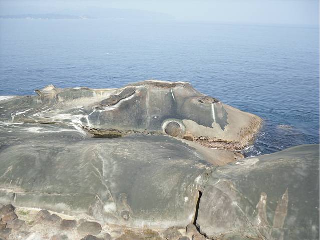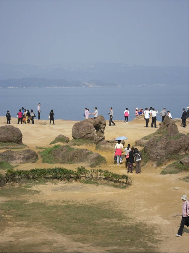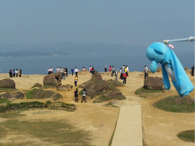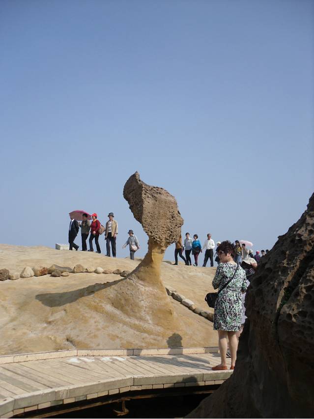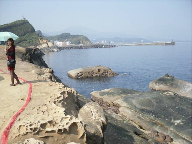 陈导说这几天我们走的高速公路是台湾第一条高速公路——中山高速公路。陈导在经过一个叫汐止的地方时,特别介绍了一下台湾比较有特色的地名。汐止名字的由来是因为基隆河受海水潮汐影响,潮涨止于此,这名字好有FEEL哦!呵呵呵呵……陈导用了一个真人真事介绍了另外一个好笑的地名给我们听:陈导的一个朋友在应征一份工作时被问到来自哪里时,朋友回答说我从水里来! 下了高速后,槑纸见到了一大片美丽的蓝,陈导说我们快到目的地了。简介说,野柳地质公园是台湾北海岸的一颗明珠。槑纸对地理不甚了解,但依然惊叹大自然的鬼斧神工!