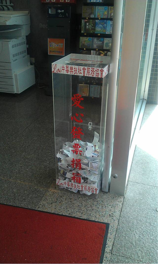 从嘉义到台北的车程约三个小时,可以补补觉啦!大巴开呀开,槑纸睡呀睡,直到大巴开进服务区。槑纸和好剌瓜在便利店买了些东西,出来时又见到这么一个箱子,于是又好奇地问阿泰,阿泰说这些箱子是慈善机构专门收集发票用的。在台湾,每买一次东西都会有一张发票,而这些发票都是可以抽奖的,很多商铺门前都会放着这些箱子,而很多台湾人在拿到发票后都会把发票放入箱子。这种随时随地随手做善事的主意值得在大陆推行啊!