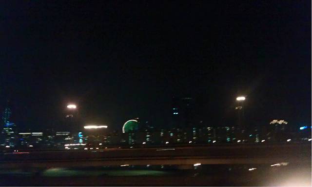 大巴终于姗姗来迟,车牌是345SS。从桃园机场到台北需要一个小时的车程,槑纸虽然觉得有点累,但是又怎么可能放过把夜色下的台湾尽收眼底的机会呢?话说大晚上的,怎么知道已经到了台北呢?看到那高高的台北101大楼了吗?看到那经常在偶像剧出现的摩天轮蚵了吗?