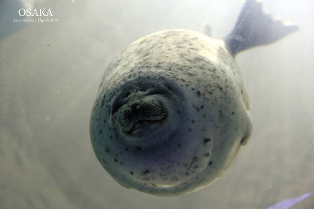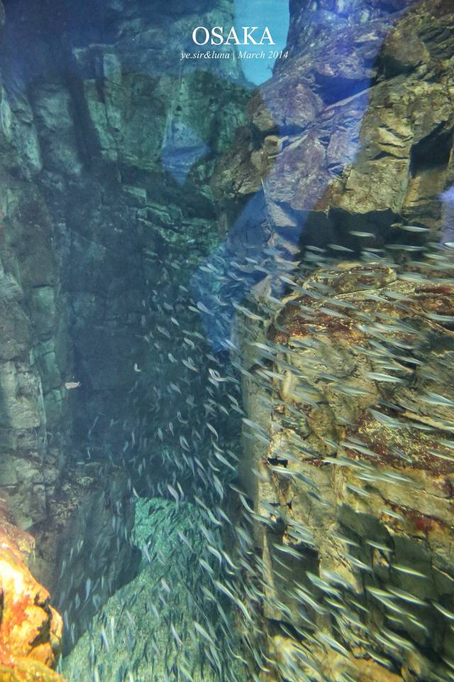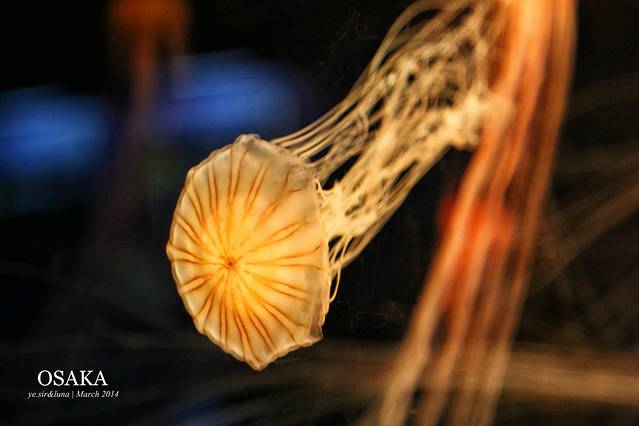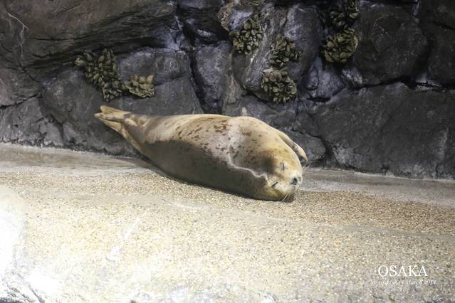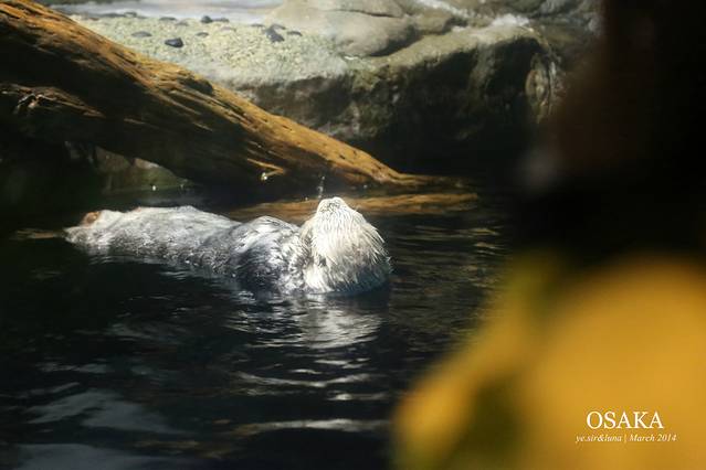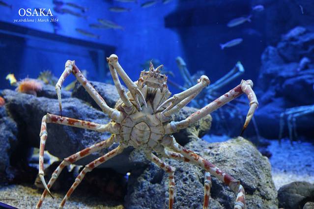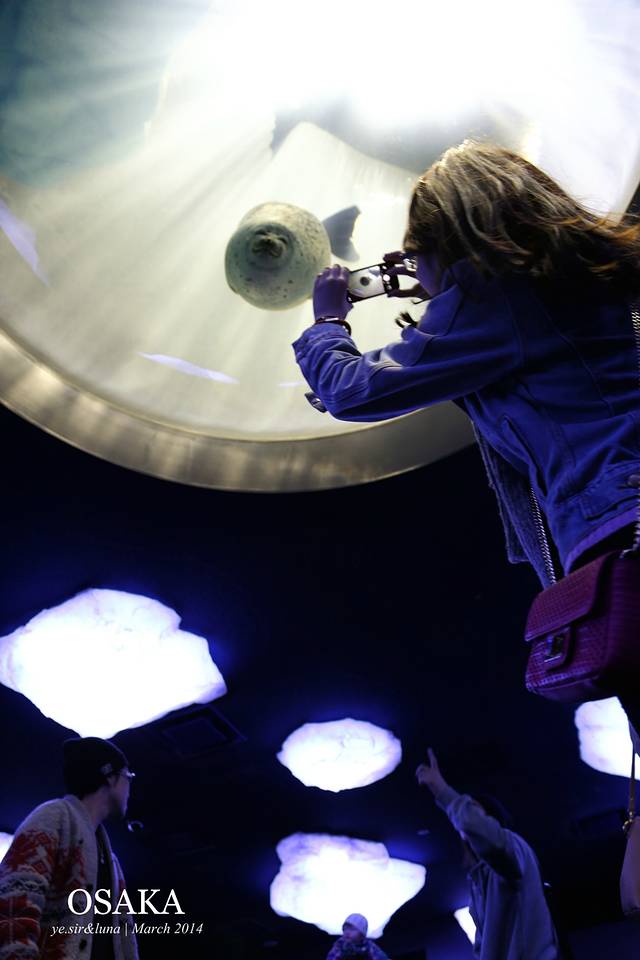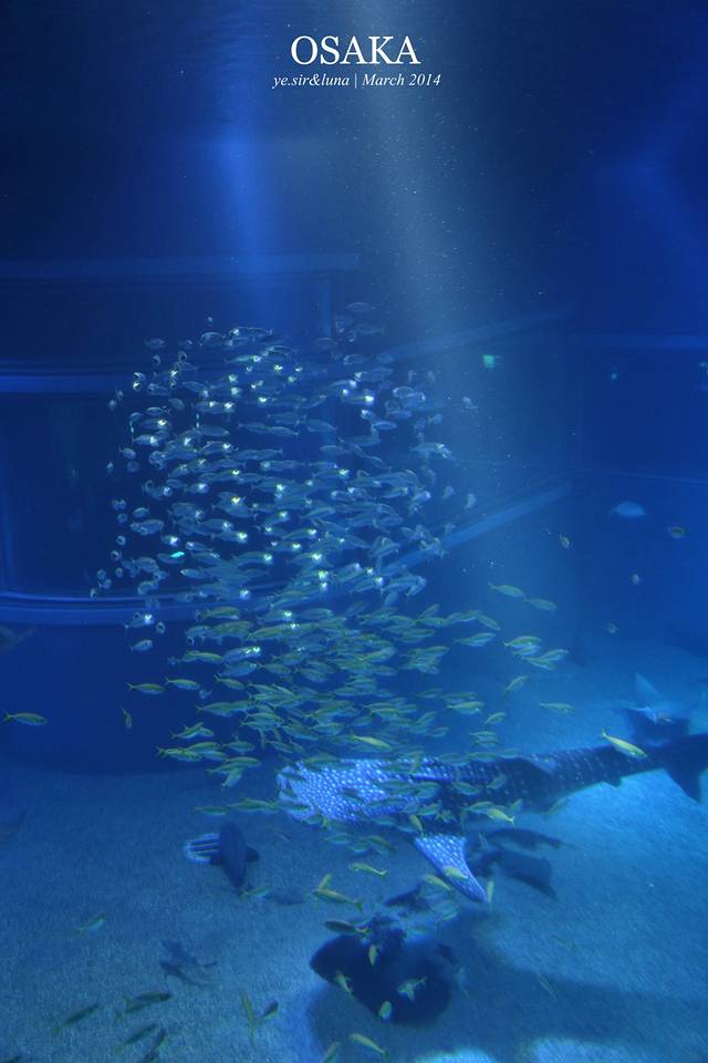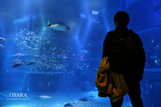 海游馆的构造很科学哦,先坐电梯上到顶层,然后围绕巨型鱼缸一圈一圈螺旋形往下走,把地面、浅水、深水层的各种小动物都看清楚!