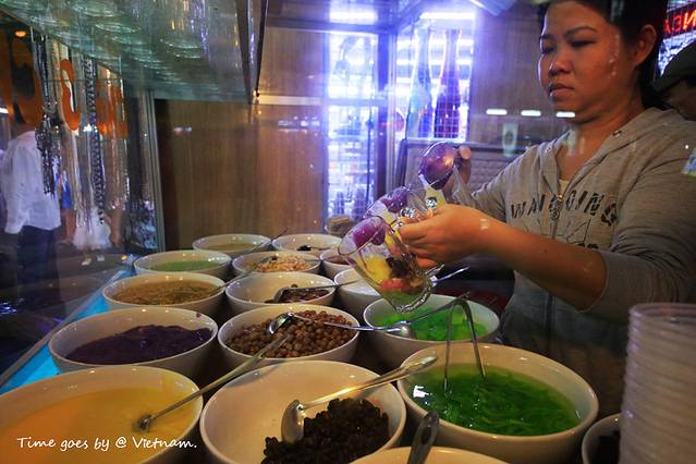 芽庄夜市就在我们住的Nice Swan对面,夜市入口处有家摊档卖杂锦冰,所有的配料各挖一勺,加上椰汁和沙冰。看着好像很恶心,但是所有东西混在一起口感很Q弹,味道也是我喜欢。在芽庄的2天,喝了3杯~