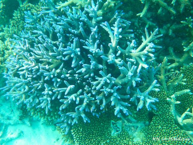 一丛丛珊瑚,脑袋尖是一簇簇蓝色,在阳光下闪烁。第一天把我吓得哇哇大叫的珊瑚,在水下看,如此之美。