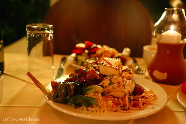 晚饭也是自助餐。我们定的房间是HB,包早晚餐,单买会很贵。我们那天点了一瓶1.5L的水,就要4美金,服务费另算。浮潜后很饿,我吃得很多,豌豆做得很好吃,肉就一般,很大块,不入味。竟然还有咖喱!我还木有从去年印度23天,天天咖喱的阴影中走出,赶紧掩鼻走过。