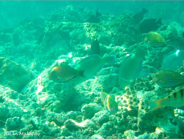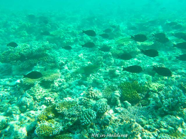 今天早上一起床就去浮潜,早上退潮,水浅一点,不用穿救生衣。蓝绿色的水浮力很大,把身体放平,脸沉在水下,基本上就沉不下去了。我就那么漂着看海底的珊瑚和鱼群。