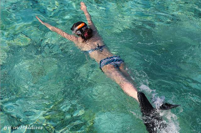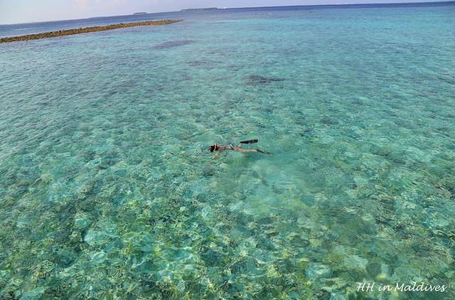 趁着阳光还不是太晒,从露台的梯子下水去玩。早上水比较浅,基本上都在我脖子以下,不过不会游泳的我还是穿了救生衣。海水凉凉的很舒服,我走远了一点,忽然发现水下有大团黑乎乎的东西,在水波里一动一动的,吓得连声大叫。邻屋的蕾蕾和男友游过来,说没事,那是珊瑚,你潜到水下去看,很漂亮,一点也不可怕。听说我没有带泳镜,她去把多准备的泳镜拿给我用。我漂在水面上看了一会,海底好美。