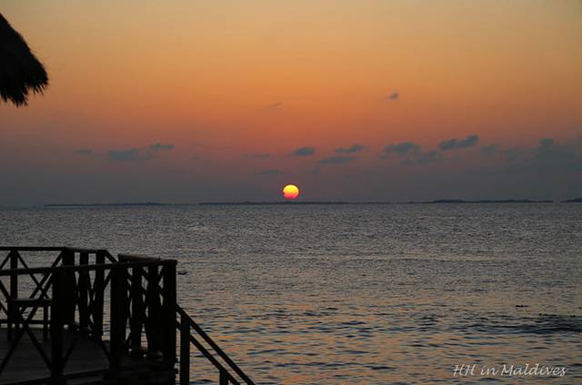 早上被床幔上投射的一道橙色叫醒,哇,日出!马上开心地爬起来,走到露台上去看日出。太阳已经跳出海平面,耀眼的橙色,海平面也被染成一圈浅的橙色,水面上被撒下无数金色的星星,在波光粼粼里跳跃。昨晚的月亮也撒下星星,那是银色的。都很美。