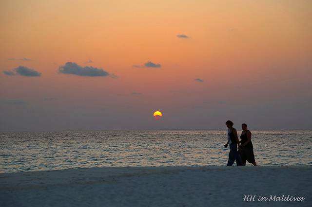 夕阳下的白色沙滩。沙子非常细非常柔,我把人字拖拎在手里,光脚走在上面,特别舒服。很多碎的珊瑚,我捡了一枚,很喜欢,不过离境时不能带走任何海里的东西。