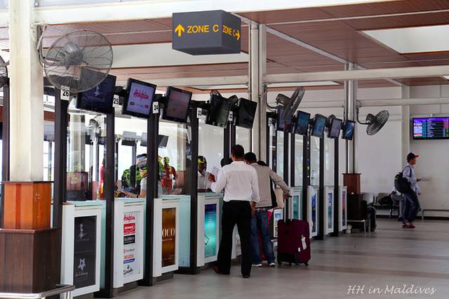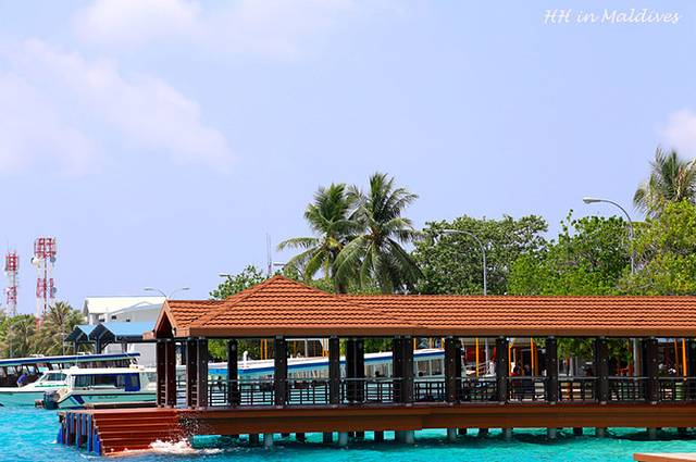 终于降落,走下飞机,热带的潮热气息瞬间浸透每一个毛孔。马累机场很小,走到大厅里,在一排排酒店的柜台中寻找我们定的酒店。