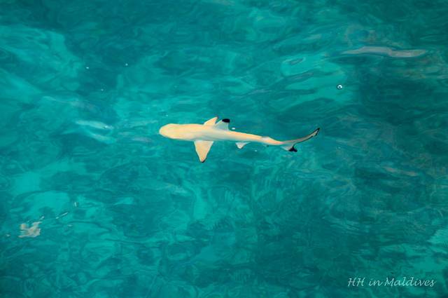 时间差不多了,回房间去整理行李,走到栈桥上,一对外国中年夫妇很惊喜地指着水里冲我们说,there,there!我往他指的方向看去,是那只小白鲨,他慢慢游过,来跟我告别。