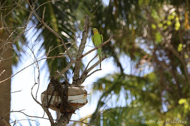 这个岛很小,我们走了一圈,边走边拍照,也就20分钟走完。岛上有很多棕榈树,树下还是凉爽的。五颜六色的小鸟用不知道哪种树的果壳搭的窝。
