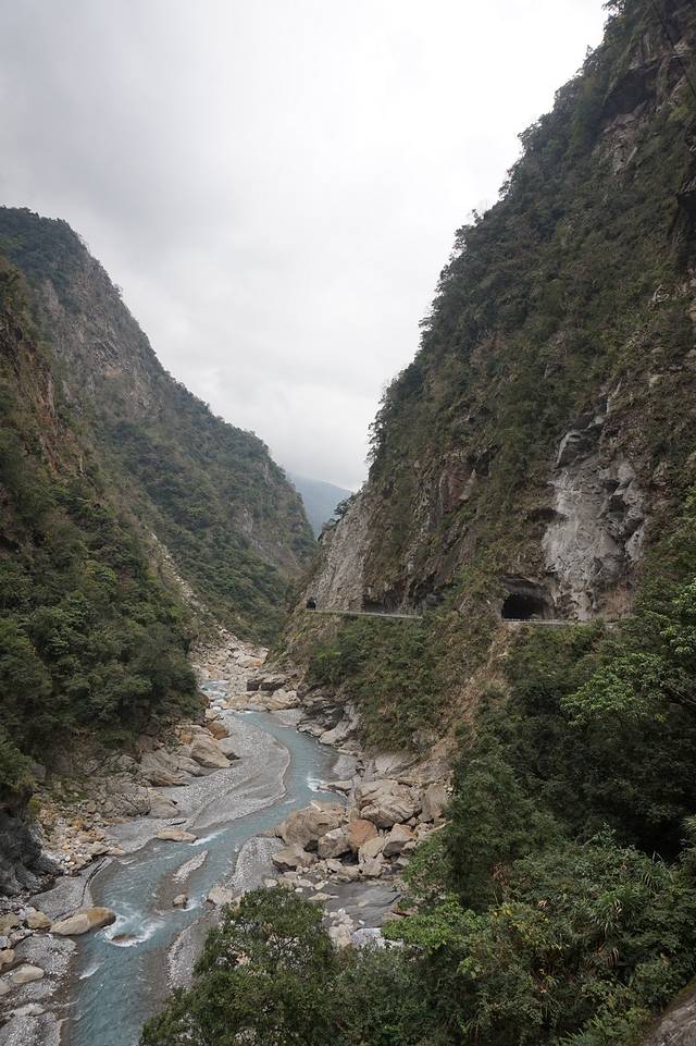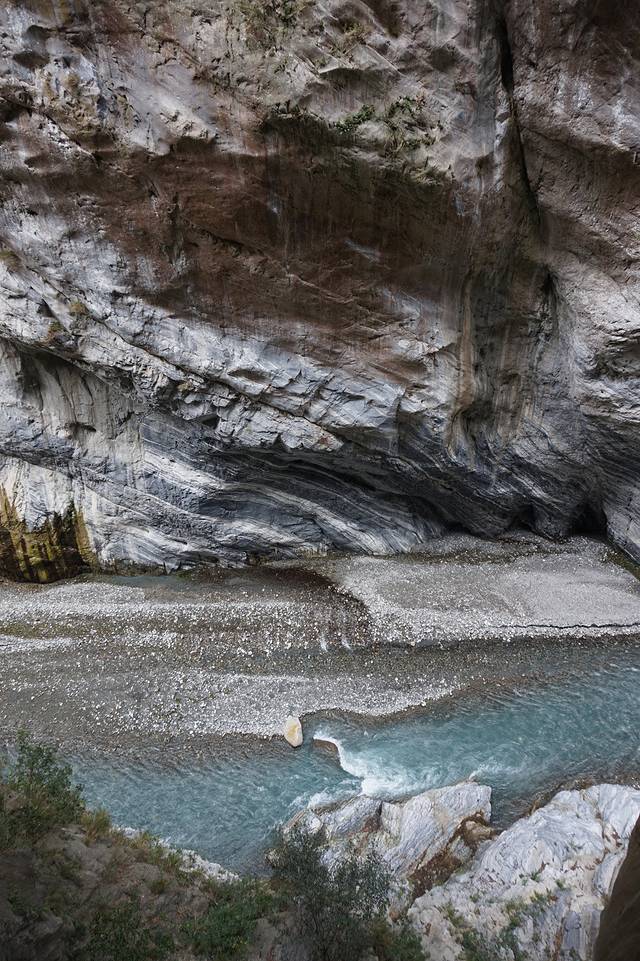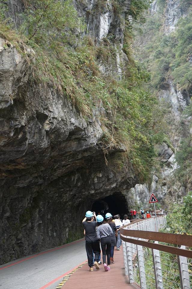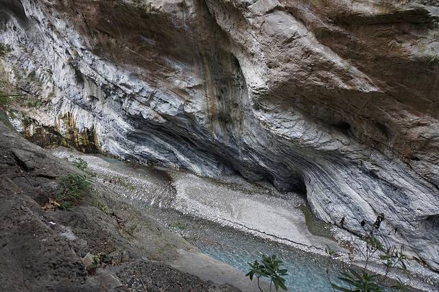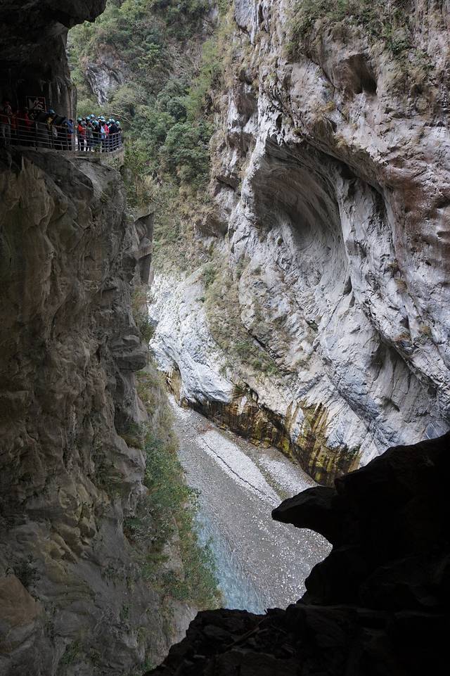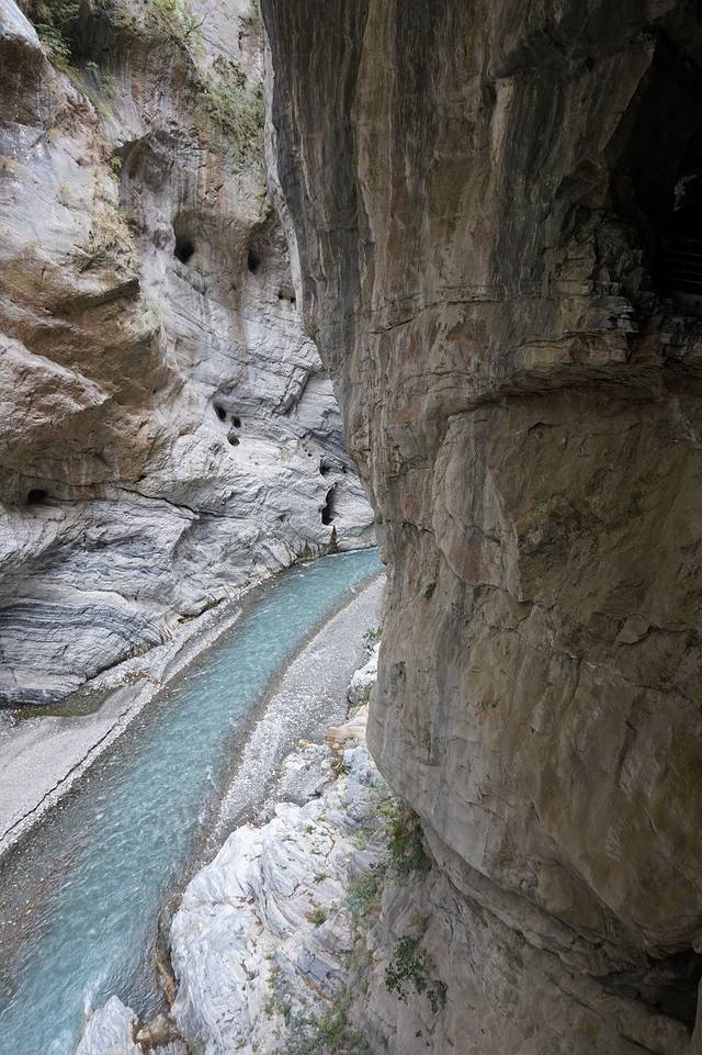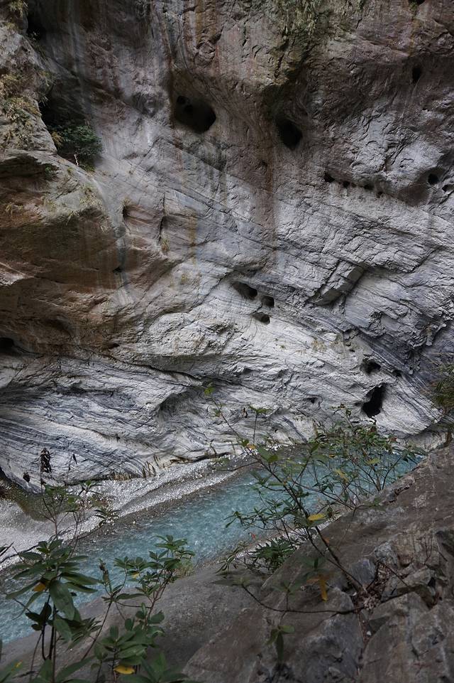 走出砂卡当步道后,司机把我们送到了燕子口。燕子口是峡谷里最窄的一段,有步道可以前行,更有步道上山,不过上山步道实在艰难,需要当局发专门的通行证方能进山,仰面看那步道,几乎是垂直的,太险了。我们走在常规步道中,在峡谷里,头顶是一线天,峡谷两旁的大理石峭壁上,有无数小岩洞,传说山谷间的燕群在其间筑巢而居,形成“百燕鸣谷”的奇景,但现在游人渐多,燕子也是三三两两。