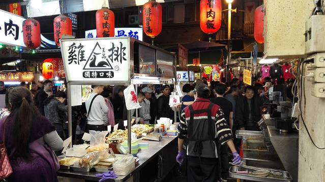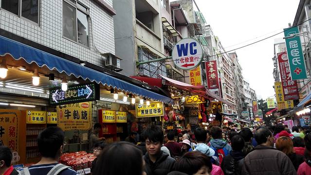 往西走,艋舺夜市的入口,晚上七点,已经是人潮汹涌了。