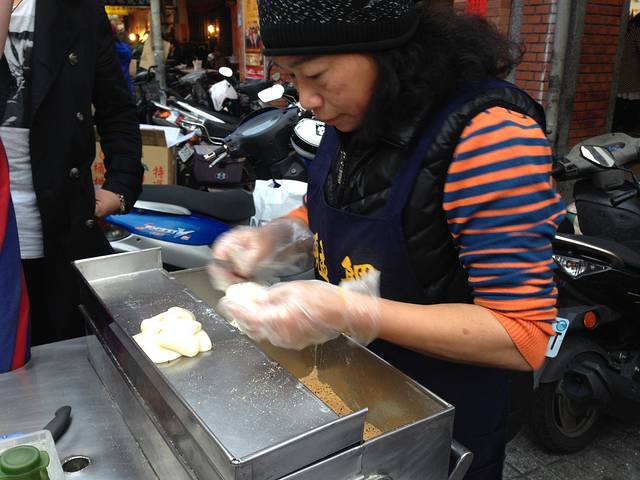 从龙山寺往东走,有很多小吃摊点。手工做麻糬的阿姨。宝妈见到手工现场做的麻薯,立马就买了,被宝爸一直唠叨:这种在哪里都可以吃到的麻薯类的就不要在这里吃了,又占肚子,影响后面的战斗力啊!