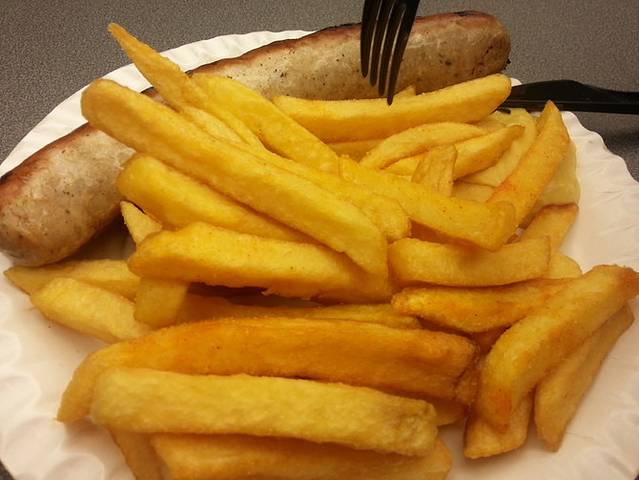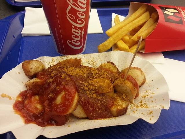 中午饭还是我最爱的咖喱肠,咖喱肠就是烤香肠加上番茄酱,再撒上咖喱粉,香肠的鲜嫩多汁配着酸甜的番茄酱再加上咖喱粉的辛辣和香气,味道很美妙!不要低估这里的薯条哦,咱们把薯条当零食,这里的薯条可是 能做主食的,量给的不少,外酥里嫩。