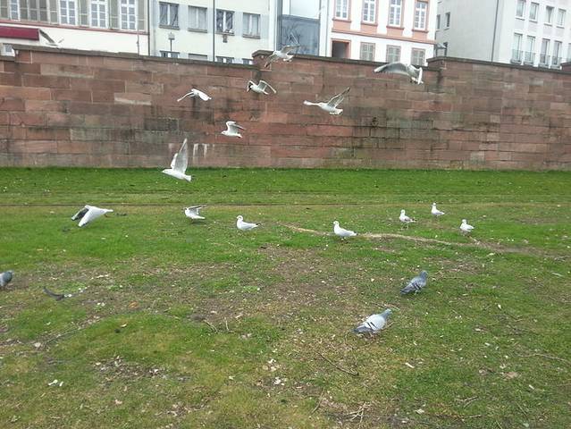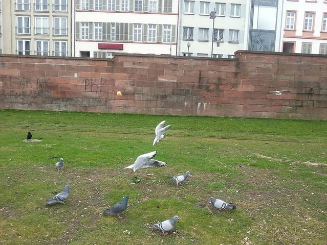 今天就要坐晚上的班机回国了,白天还可以随便逛一下。拖着箱子去美因河畔坐坐。带了个面包喂喂鸽子,结果笨鸽子没吃几口,水鸟就都飞过来了!它也没吃的了!