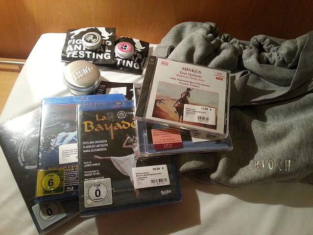 我这两张蓝光,一张DVD,两张CD差不多140欧。旁边的灰色包包是著名芭蕾品牌BLOCH的练功包。