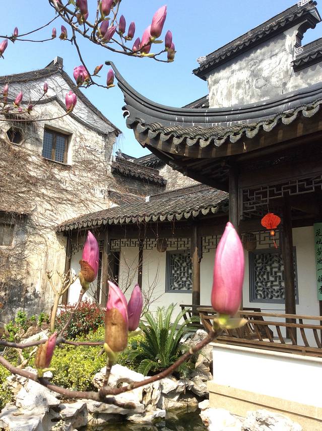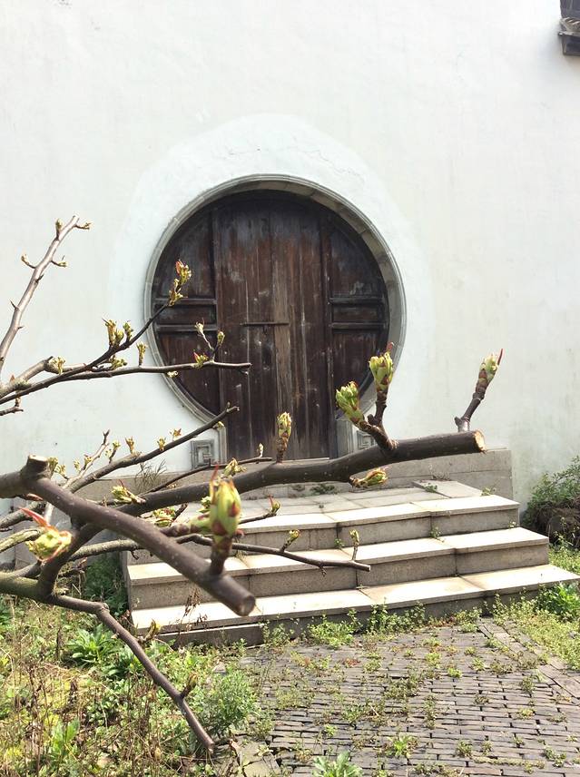 白墙黑瓦园拱门,枝桠嫩芽春盎然,瞬间觉得自己在美景的熏陶下,也开始意犹未尽了。