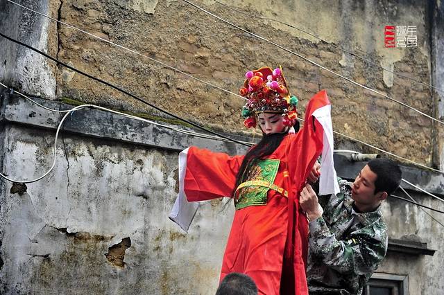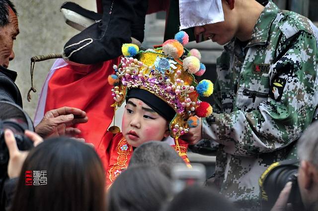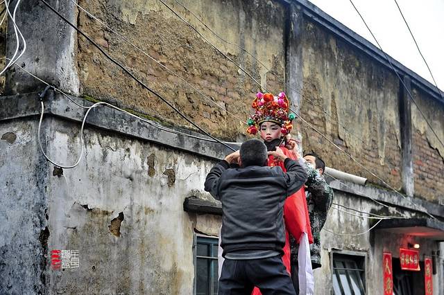 我们走进村子,先去探访下有关走古事的准备工作。在鞭炮声声不断的村巷里,寻找到了正在给小孩装扮的人们。