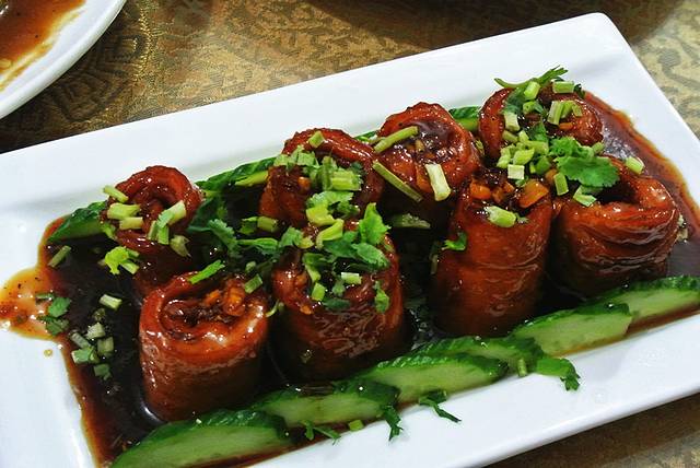 九转大肠: 因为我之前从没吃过九转大肠,到底是咸是辣我也没研究,就说说我吃到那家的吧~是像卷寿司那样卷的很扎实,味道不是那种我以为的浓重口味,反而后味有点酸甜,所以觉得不腻口,没有什么异味,相比有些人发的很可怕的大肠,我吃的这家做的算是细致了(因为有人拍的九转大肠就是炒肠片。连转都没转,大肠边还放一些黄瓜片,一块大肠一块黄瓜,搭配很好~ 一盘8个50元,刚开始端上来的时候我想说,大嫂你狠,这么8个就要50块,然后...我真的错了。这8个吃的我俩都快昏了,一口放进嘴里咬下去,哇哦~口感扎实,好吃到爆啊~我说大嫂,这卷的也太结实了吧,您也太实在了,你可以和那些奸商一样卷小点,卷薄点~我们是不会知道滴,呵呵~ 要说8个看似少,但是料很足,吃完这个就要打嗝了,咳咳,绝对是硬菜中的无敌战斗机!
