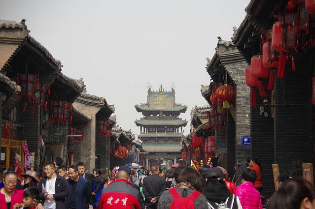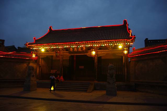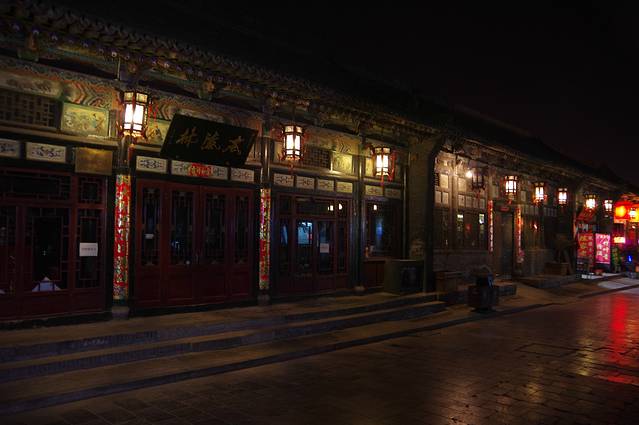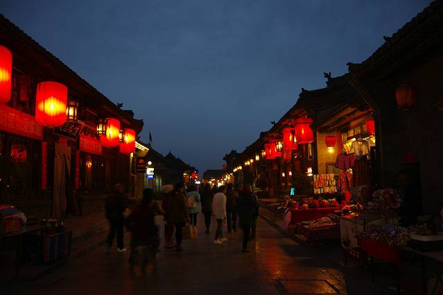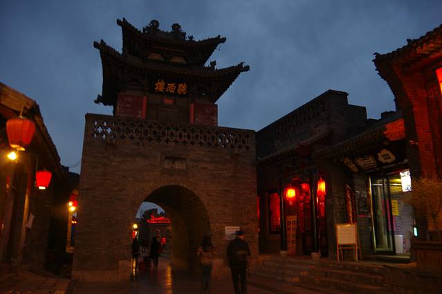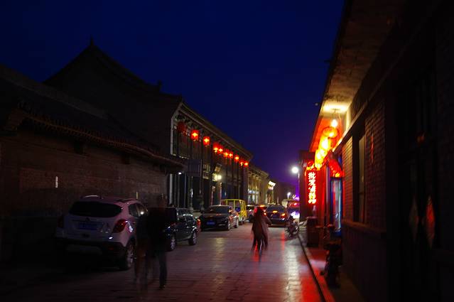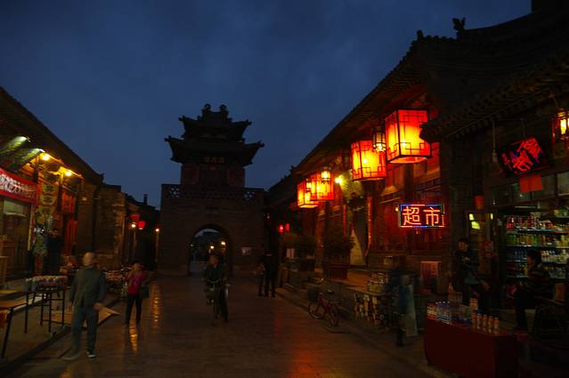 从客栈出来已经天黑了,平遥古城的夜景不可辜负。从平遥县衙门口往南,一直走到南门,南门是新返修的门,晚上的灯光会好很多,这里有包车逛平遥的电瓶车,我独子一人花50块钱包车玩了一圈,感觉好差,包车的师傅对古城的历史并不太了解,知道的跟我差不多,也是刘伯温建了两座城,北京的八臂哪吒城和平遥的乌龟八卦城之类的传说。倒是教我了几句平遥地方的方言和童谣,内容挺有意思,说的是让给麻姑子吃了老汉汉,我们就可以偷吃老婆婆炕的馍片了。这是这位师傅说的他的童年的故事,他告诉我,平遥古城之所以能保存到现在,完全是因为当时拆迁的时候没有那么多钱,所以只好去建新城,真的好险。万一那个领导来视察,说不定我们就不一定再看得到这美景了。电瓶车带我转了一圈,了解了古城的大概之后,我便在古城最繁华的地段下了车随便走走,古城商业气息已经很浓了,路上好几拨人问我打听明清酒吧一条街,街面两旁都是卖东西的小商小贩,好在平遥这里的特产实在不少,醋、牛肉、漆器、枕头,也是值得去看看。平遥古城里住有四万多人口,这里的旅馆和农家乐多的数都数不过来,临街的几家大的客栈看着古色古香的,妆点了红色的气死风灯,也算是古城的一景了我在鼓动平遥的音乐店买了一张CD,又在一个旅游纪念商店买了一个平遥旅游的书签,最后还想买点醋可惜包里实在太满了不好装,第二天又赶路,最后还是带着遗憾离开了平遥。