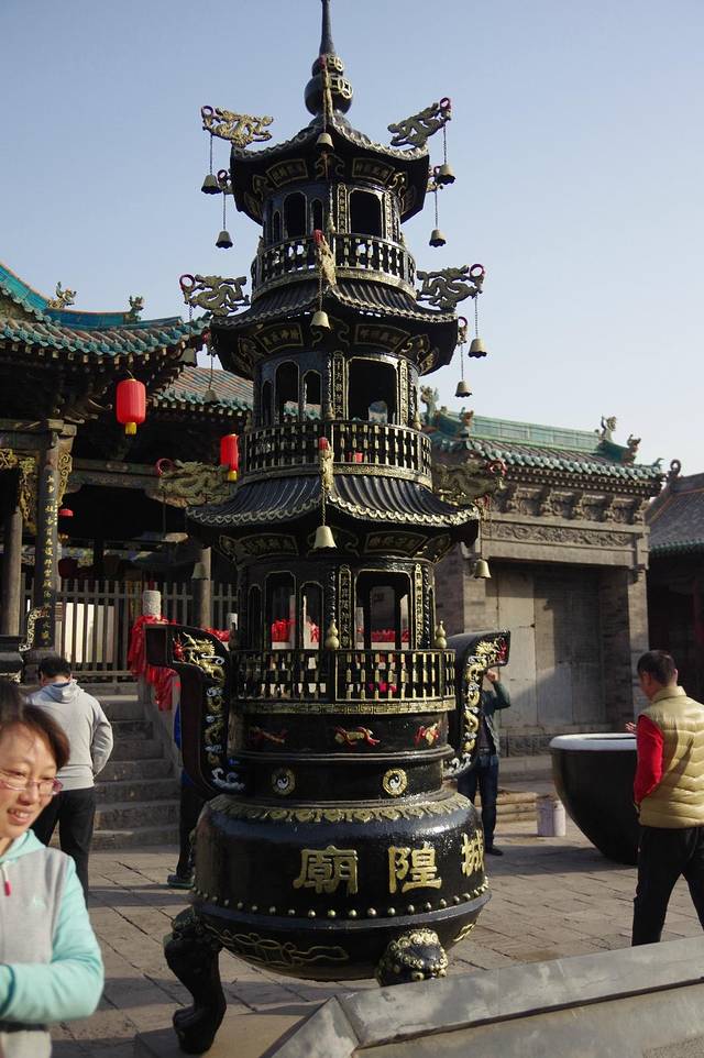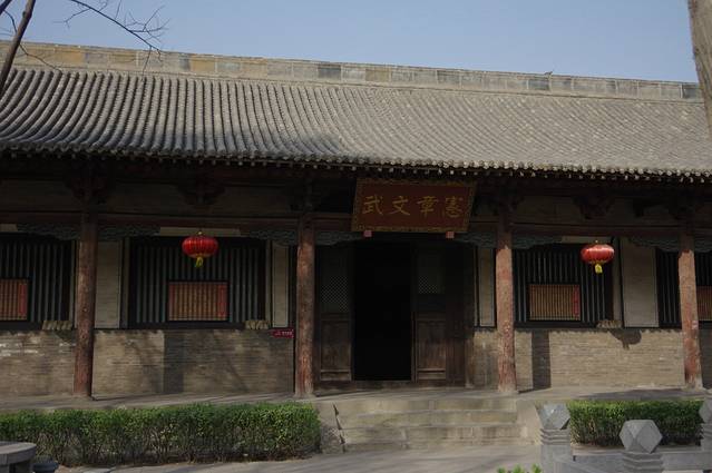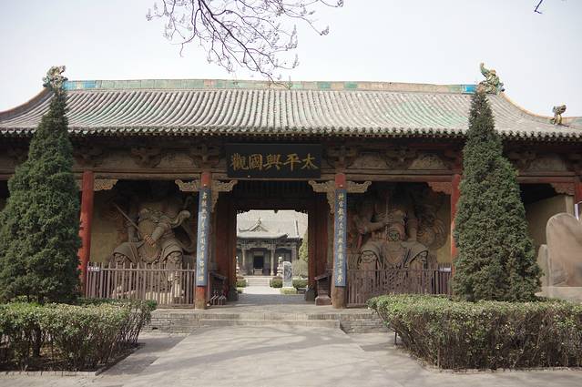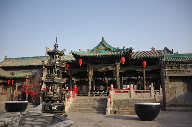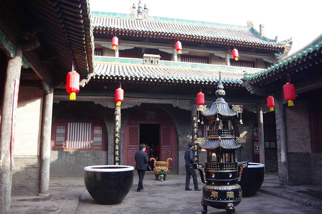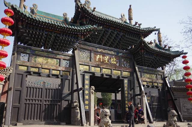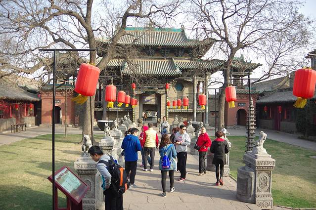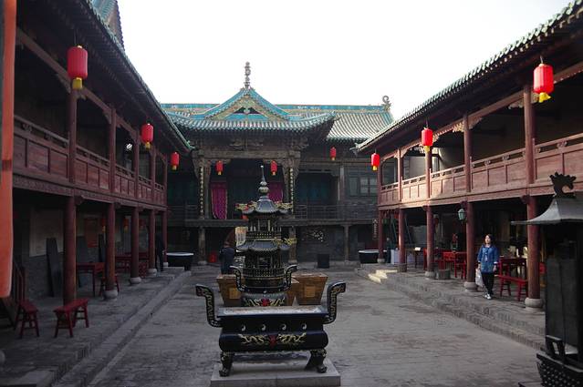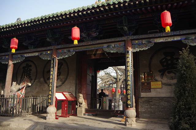 第二天早上七点半起来,八点就去排队买票,不过买票的人并不多,我排了第一个,一百二十块钱,19个景点。买票的时候需要提供身份证,因为进每个景区都需要扫一下码。另外,票面上的地图里是没有市楼,可能是因为不让上去也没法收费的原因就作为免费景区了,但是在平遥古城的大地图上,重点旅游景区都是用景观图标标注的,一张地图三块,建议去玩的人买一份。买完门票后,因为九点半在县衙有大兴演出,我就没先去县衙,而是沿着衙门里往东走,先去的城隍庙。路上顺便吃了早餐,羊杂汤和手抓月饼,说实话,手抓月饼不好吃。城隍庙和财神庙是一起的,到的时候正好蹭到了别人的导游,跟着把城隍庙逛了一圈。后来看网上说这里还有一个金屋藏娇的典故,只是当时看的时候没有仔细的找找金屋。城隍庙的隔壁就是财神庙,庙门口有一个大戏台,据说以前唱戏的时候中间的场地不能坐人,而现在这里有演出的话,中间坐的是领导。