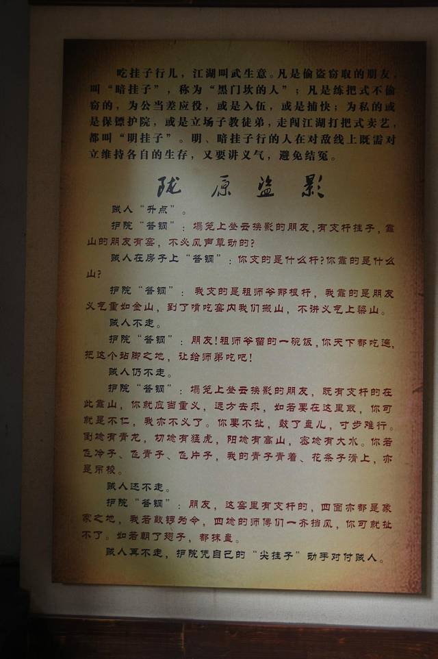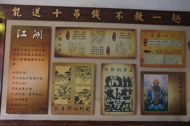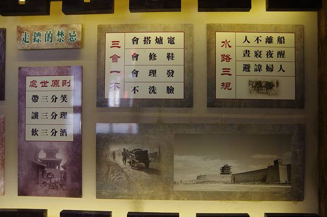 从县衙出来,向东,然后向北就到了南大街,这里有中国镖局、同兴公镖局我选择了去中国镖局。要说这次来平遥,最不虚此行的地方可能就是这里了,彻底打翻了我对保镖一行的认知,将十几年以来武侠小说树立的印像击的粉粉碎,原来镖局是票号应运而生的产物,而武林也多是通过武馆和镖局来流传的,在这里见到了很多历史上熟悉的人物,大刀王五、达摩祖师、霍元甲等等,都跟镖局有千丝万缕的联系。这里还可以看到好多以前江湖的规矩和切口儿,大脑亟需扩容。
