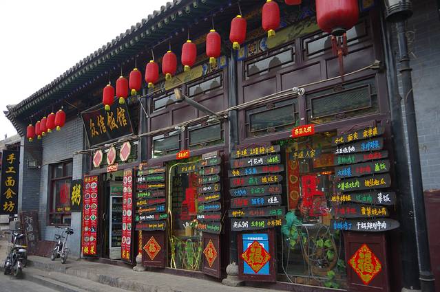 郑家客栈古色古香,是以前古城的老房子改的,在古城重要交通要道衙门路的路南,离平遥县衙不过200米,县衙门口就有一个卖古城景区通票的地方,古城18个收费的景点一共120块钱。门口吃饭的地方不是很多,不过在平遥古城里不愁找不到吃的,网上大部分推荐背包客和驴友餐厅,我没有去,来的时候路过桃花面,不过实在有点远,就在附近的一家面馆吃了一碗面,要了一份平遥牛肉,味道非常好,尤其是平遥的醋,倒出来的时候有点粘稠的感觉,吃起来香的不行不行的。郑家前台接待客人的地方看着挺小资的,昏黄的灯光、有茶几、台球桌,俨然一个小吧台的样子,还真有几位国际友人在那聊天。这里是可以用国际青旅的卡的,打完折35块钱一晚上,还真是便宜的很。从前台接待的地方往里走,是一个小院,好几拨人正坐着聊天,小院两边的厢房都是客房,我住在临街的二层,里面5个床位,四个床位是上下铺,第五个好像是以前的炕改的,不过在角落里,感觉睡得不会很舒服。房间里灯光一般,不过黄色的灯也显得床铺干净,而且下铺似乎大好多。床前是柜子,可以锁贵重物品。就是上厕所不太方便,需要出门下楼,不过感觉住这里还是挺有古城的感觉的,也许北门外面的农家乐也是这样的。我来的时候天气很好,晚上在古城逛完了还在这里跟天南海北的朋友一起喝酒侃大山,还是挺好玩的。