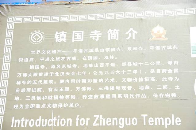 出了双林寺,路上空荡荡的一个游客都没有,坐108返回平遥也没有见到再有上车的乘客,整条航线就我一个人的了。到了平遥汽车站,买了去王家大院的车票,发现还有一个多小时的时间,正好有个开黑车的师傅说他今天还没有开张,我们两人大概一商量,60块钱速速去镇国寺打个来回,只要保证我在长途车出发之前回得来就行。