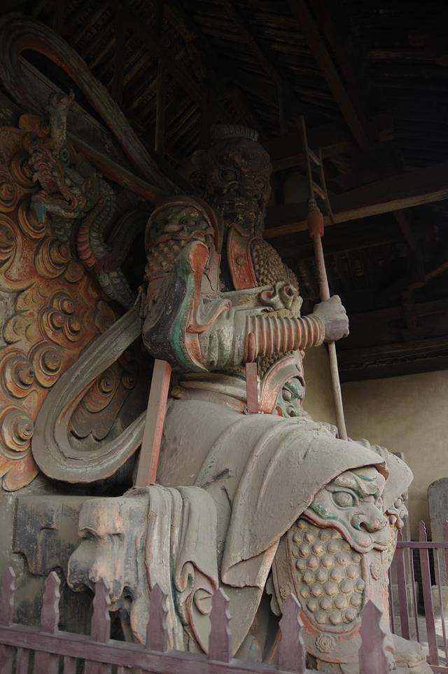 来的时候这里几乎没几个游客,花30买了门票,因为没有别的游客了,也蹭不到导游,最后只好自己花钱请了一位导游。双林寺始建年代不详,是民间参拜的寺庙,每逢初一十五,这里的香火才旺盛,进到山门里,有威武的四大金刚。双林寺里的佛像都是木雕泥塑,眼睛部分用的是黑琉璃,比很多地方令人恐怖的木雕神采不知道强多少倍。从山门里进去,不论你站在前面广场的哪一个地方,都会有一个金刚在看着你。这在后面几个殿里感觉特别深刻。有一个观音坐像前面立着一尊韦陀,叫做八眼韦陀,身上有八个这样的黑琉璃眼睛,我每次举起相机就觉得他在瞪我,一再退缩之下,我连给那韦陀拍照的勇气都没有了。整个寺庙逛完,才觉得没拍几张照片有点冤,可又觉得神奇,难怪头天晚上那位朋友一再推荐这里呢。双林寺是一个以泥塑艺术文明的寺庙,这里的泥塑彩绘形象多样,镂空的泥塑更是让人为之瞠目结舌,而神佛形态平易近人,为修建庙宇的人塑等身像,寺庙里最后面的是欢迎人们到西方极乐世界来的阿弥陀佛,都是劝人们皈依行善的,可见双林寺跟我之后去的镇国寺的宗教作用是完全不同的。