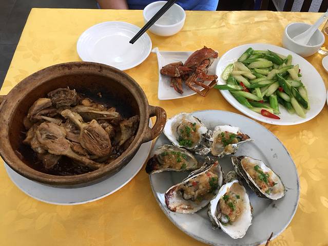 姜母鸭,生蚝,煎蟹和炒芦笋