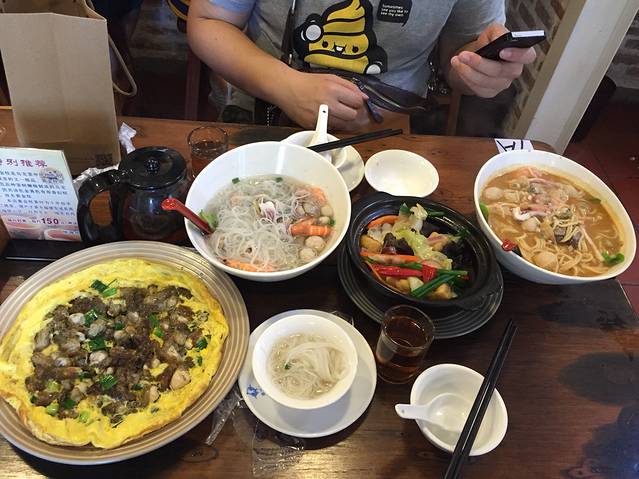 强烈推荐的捞海坞,由左至右是海蛎煎,海鲜捞面,素菜煲,海鲜沙茶面。海鲜配料真的很丰富!