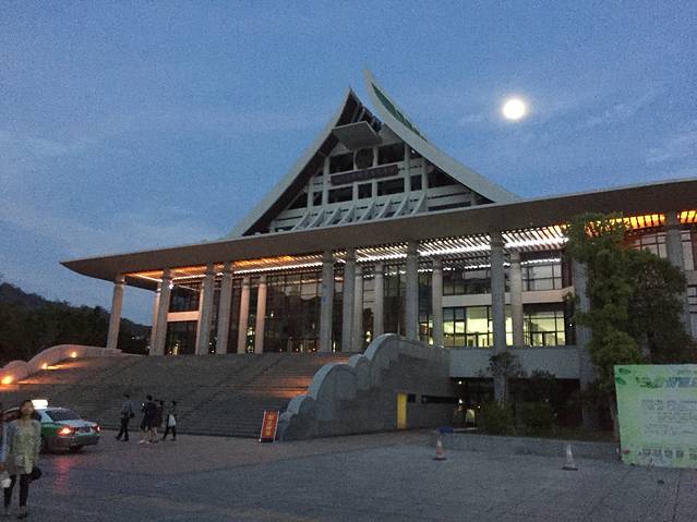 很喜欢科学艺术中心的外观,有种博物馆的味道。再往前走道路两旁一侧是运动场另一侧便是群贤楼群。群贤楼是厦大最古老的建筑,也是自习室和实验室所在地,听着广播趁着月色看学生在里面孜孜不倦,不知不觉便走到了西校门。