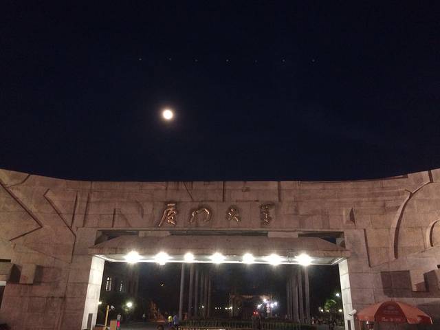 从西门出来的厦门大学牌匾,这个时候天已经全黑,月亮在校门之上很美