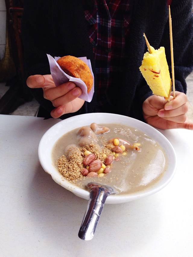 图左为黄桂柿子饼,图右为蜜汁桂花糕(记不太清了)。味道是甜的,纯甜而不是香甜,不喜欢。图中为麻花油茶,顾名思义,麻花+油茶😂味道挺怪的,有花椒在里面,味道自己想象吧。。