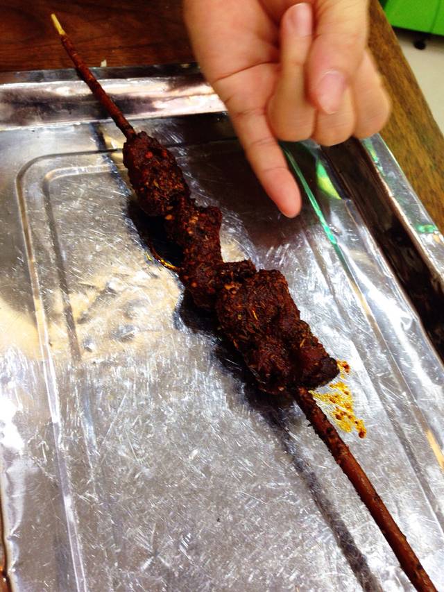 因为上述食物都不太合口味,于是我们又点了串红柳烤肉。啥肉?我是看不出也尝不出。一入嘴一堆孜然之类的调料,啥味儿都给盖了,肉也柴的要命。。。。。只有种越吃越上当的感觉😂