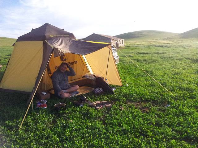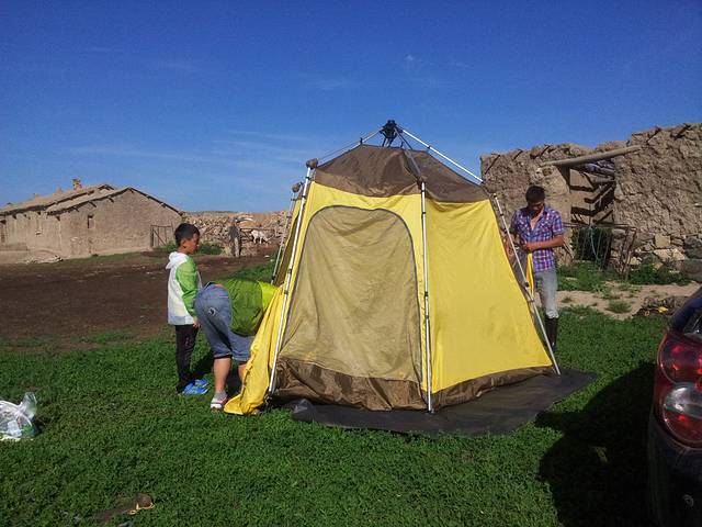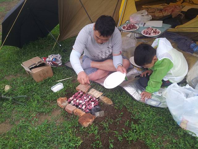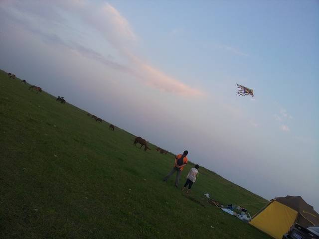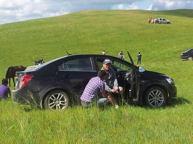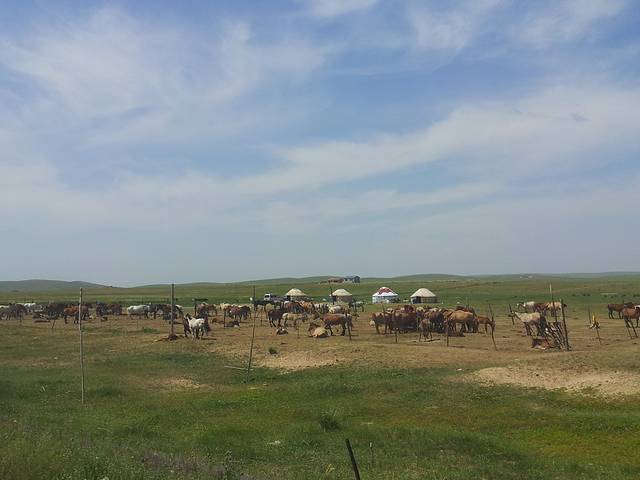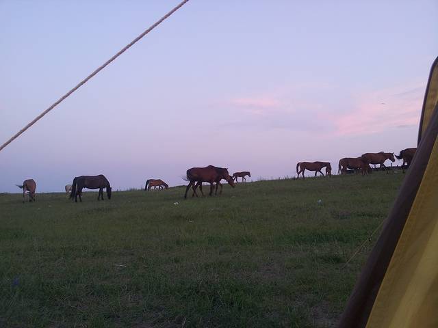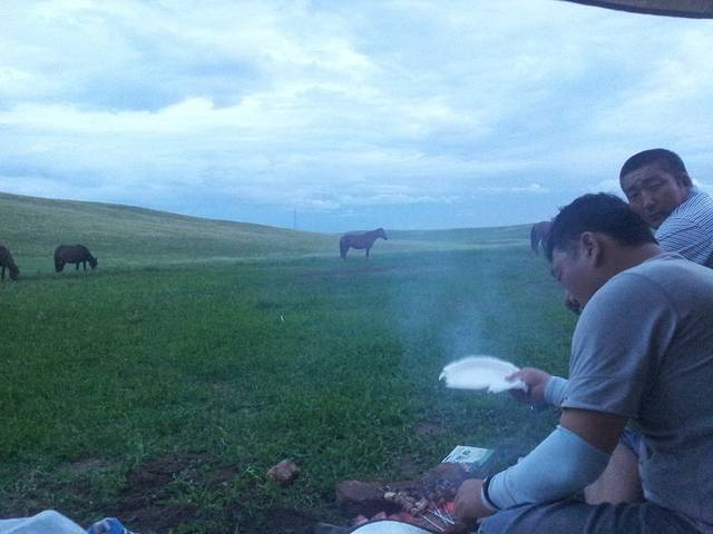 一路开到了东乌旗,路上买了两条羊腿,是时候挑战烤羊肉串了,接着就是找地方露营,到处绿草青青,我们还是决定深入草原找一户真正的牧民做邻居。所谓深入草原,就是要下公路走土路,顺着土路一直走,总会发现牧民的家,果然走了很远的烂路,找到一家牧民,后来我们在地图上找到了这个地方,名叫巴彦霍布尔,征求同意后帐篷就搭在人家家边上,位置绝好,马儿就在我们边上走来走去,自制羊肉串也隆重登场啦,味道简直好到无法形容,拿给牧民吃也是赞不绝口,而且我们得到一个重要信息,第二天一早有那达慕大会,牧民可以带我们过去一起参加