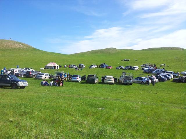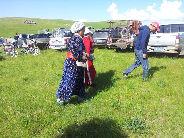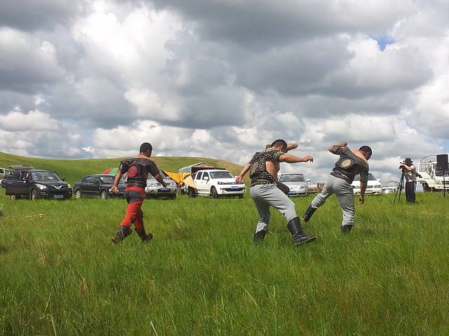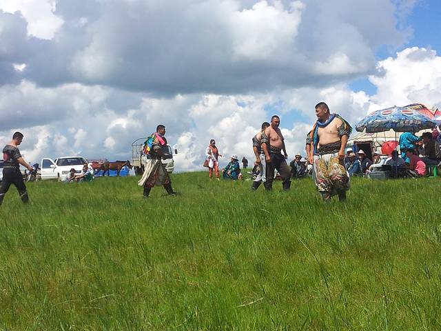 草原深处纯正的那达慕大会,貌似我们是唯一的游客,mailto:&#@*%(&#@*%…完全没有翻译) 一句都听不懂,酥油茶和各种点心都是免费的,没有牧民带路绝对找不到的地方,起晚了赛马已散场,摔跤比赛看了个够,十六强八强四强半决赛决赛一轮轮下来瘦子一个个被淘汰,穿着传统摔跤服的壮汉威武雄壮!!!话说老公混迹在牧民中喝酒毫无违和感呢,那达慕大会也是牧民喝酒大会,别问喝了酒怎么开车的傻问题,这里的车在草原上任意狂飙驰骋完全不受限。