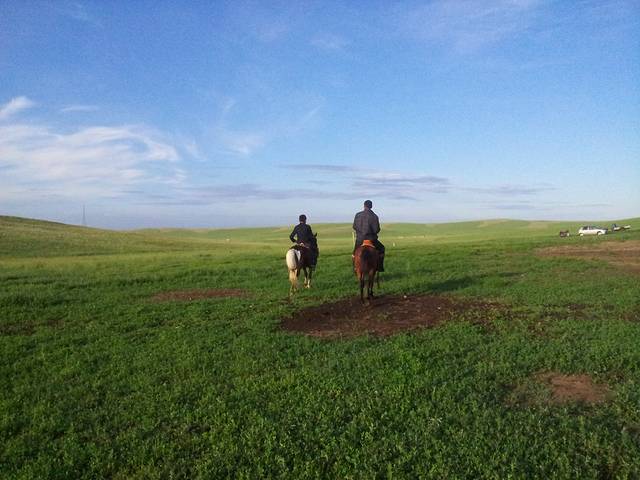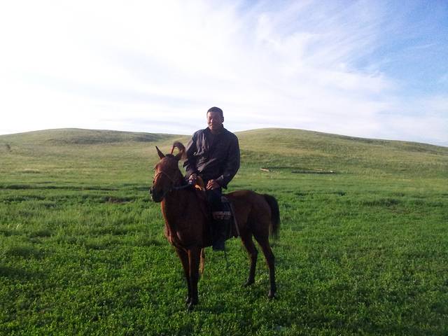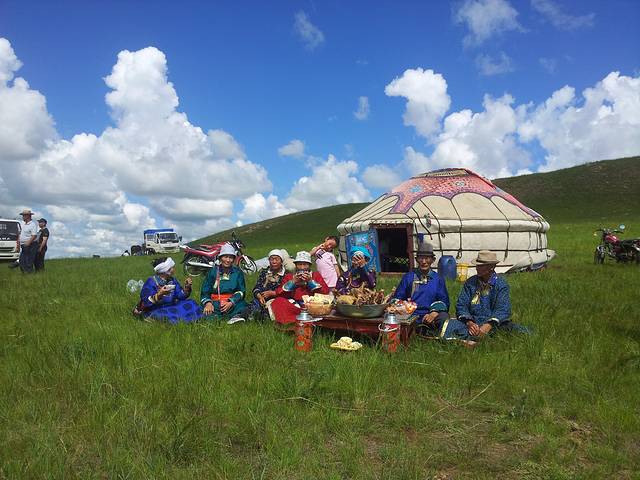 有些缘分可能一生只见一次,但却难忘。这户牧民的男主人名叫布和巴特尔,眼睛像草原的天空一样清澈,对朋友是掏心掏肺的那种好,通过接触我们了解到他和妻儿、小舅子一家、丈母娘生活在一起,家里有三百只羊,几十匹马,一辆汽车两辆摩托,他喜欢骑马,但不喜欢像其他牧民那样骑马去追逐羊群,他相信羊吃饱了自己会回家,没必要跟在羊的屁股后面,有时羊几天都不回家,他才会骑摩托出去兜一圈,还有,他的酒量很赞。第一次见面他在门前整理草垛,我们问他能不能在他家边上搭帐篷,他找来会讲汉语的儿子当翻译,然后说搭什么帐篷,就住他家,我们推辞再三,说是喜欢住帐篷,他才作罢,接着就帮我们找一块平整的地方作为露营地,他没有问我们名字,只是用汉语叫我们。。。朋友。搭帐篷的全过程他都很认真的参观,然后感叹帐篷的方便与结实,我们把烤的羊肉串拿给他们吃,还给他们冲了咖啡,他们第一次喝咖啡,觉得味道很奇特。之后老奶奶端来了自己做的奶豆腐,邀请我们到他家里作客,老公喝了不少,神奇的是男主人的汉语和我老公的一样差,两个人却用简单的汉语聊得特别开心,最后还一起唱起了歌,在牧民家里时,我出于礼貌并没有拍照。我曾经看过别人的内蒙游记,去的是专门招待游客的牧民所谓的家,那里的酥油茶都是计费的,唱敬酒歌也是收费的,其实只要你有时间和诚意,就可以走进牧民真正的家,互相叫一声朋友,吃到牧民的家常饭和奶豆腐,这里的真情是免费的。