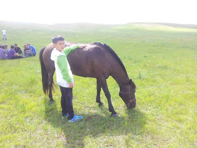 一晚上都难掩兴奋之情辗转难眠,想着早点起来去看那达慕大会,结果就起晚了,牧民一家都不好意思叫我们起床,只留了一个牧民蝈蝈等我们起来再给我们带路,路上我们听说那达慕大会的赛马已经结束了,幸好还有摔跤比赛。我们一家都是懒虫,来内蒙十天了,每次都睡到天大亮压根没见过日出,这次更过分,连赛马都错过了,看儿子失望的样子,牧民蝈蝈安慰他说看不到赛马也可以摸摸马的。。。