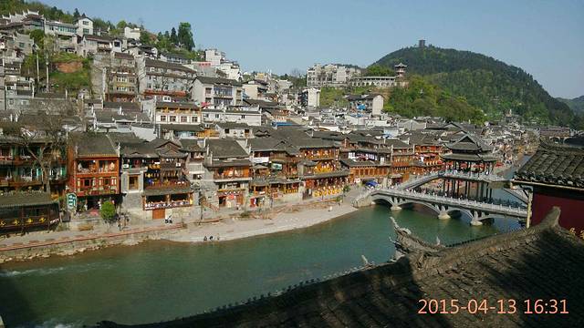 睁开睡眼惺忪的双眼,很快被车窗外的风景吸引了,一觉醒来已是南方的景色,娇艳欲滴的翠绿在北方是看不到的。一路走一路皆风景……一位天津独自旅行的大姐把他的详细攻略给我们看,我们决定结伴而行,这个决定让我们节省了凤凰的148元的门票钱。下了火车同车厢的吉首母女给我们指路到吉首火车站,一番抢座后坐上了通往凤凰的班车,每人24块钱,四十分钟后到达凤凰新城,换上公交一路,我们在南华门下车后等候客栈老板来接。来前看各种攻略可以逃票,可是没想到这么简单就进了城。老板很热情,被我们一群叽叽喳喳的女人围着有点手忙脚乱,看过房间后决定在这落脚,两个房间各80,凤凰的住宿还是很便宜的,干净卫生还很有调调,稍息片刻老板娘一桌热气腾腾的晚餐端上来,吃罢晚餐便迫不及待的来到沱江边,凤凰的夜景真的很美,既是独立的,又是整体的,两边的吊角楼里灯光闪烁,音乐躁动,这就是传说中的酒吧一条街啊!一路走,一路各种的拉客,最后选择了一家《《凤凰传奇》》,可能是老了,融入不到这年轻的小孩中间