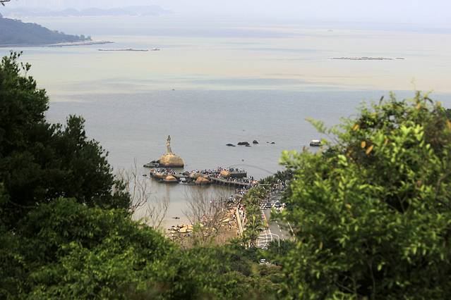 从山顶上可以看到珠海渔女和海景。不过渔女那聚集了好多密密麻麻的人头。看起来没那么赏心悦目了。海景真的很美。山上凉风习习,视野很开阔,很适合吃雪糕!!