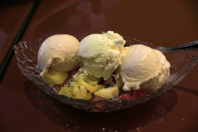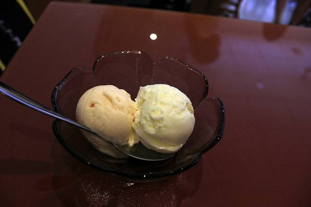 逛完了海边吹完了海风当然还是要吃吃吃!因为有珠海本地的同学,所以他带我们去了个相当偏僻相当难找但是据说相当好吃的甜品店,叫楠椿,我们从珠海渔女附近搭99路公车到了百货公司公交站,然后被朋友拐来拐去带到了那家店。店面很小,但是顾客很多,我们等了一会就坐下了,虽然说那的招牌是芒果二重奏(听名字逼格很高有木有)但是我们居然都没点!哈哈哈感觉太大一份了实在是吃不完。于是点了双雪球和什果船还有咖喱墨鱼丸。真的很好吃!!!浓浓的奶香味和水果味!价格上不是很贵。