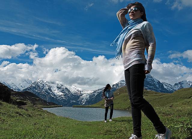 原来缆车上到First后,还要1小时hiking才能到Bachalpsee。对hiking无能,又穿得太少的人来说,已经是巨大考验。看到当地老爷爷老奶奶柱着登山杖爬得很轻松,心中狂汗。