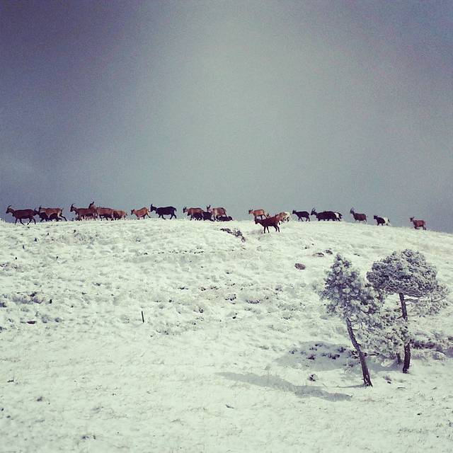 很幸运,在准备下山时,碰到了这群无人看管的羊,它们脖子里挂着铃铛,一路叮铛作响的从山下往上爬。走到我们面前时,它们也停下了脚步,大眼瞪小眼一番后,它们又悠然得自顾自的边吃草边向更高处爬去了,伸手敏捷。