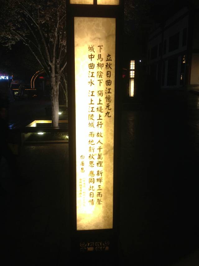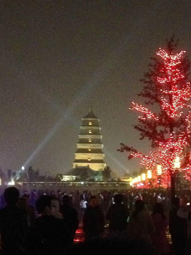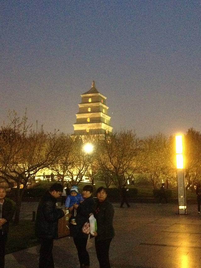早晨的飞机太早,吃饱了开始犯困,回客栈睡了一觉,到5点的时候在周围逛了逛,找了一家小店吃的凉皮和肉夹馍,肉夹馍里的肉就是红肉啊,这感觉,一个肉夹馍管饱!吃饱了打车去到大雁塔广场。晚上的大雁塔广场很有味道哦,广场上有历史典故的雕塑,连路灯柱上都是古诗。这是多有文化底蕴啊~来大雁塔就是为了看喷泉哈,还不到8点,喷水池旁就全是人,我们找到一个空位,一直等啊等啊等,喷泉表演准点开始了,喷泉规模确实很大,挺震撼的,持续的时间得有半个小时吧。值得一看。